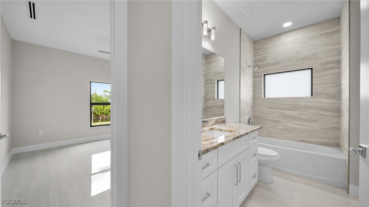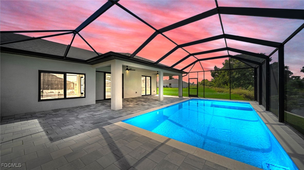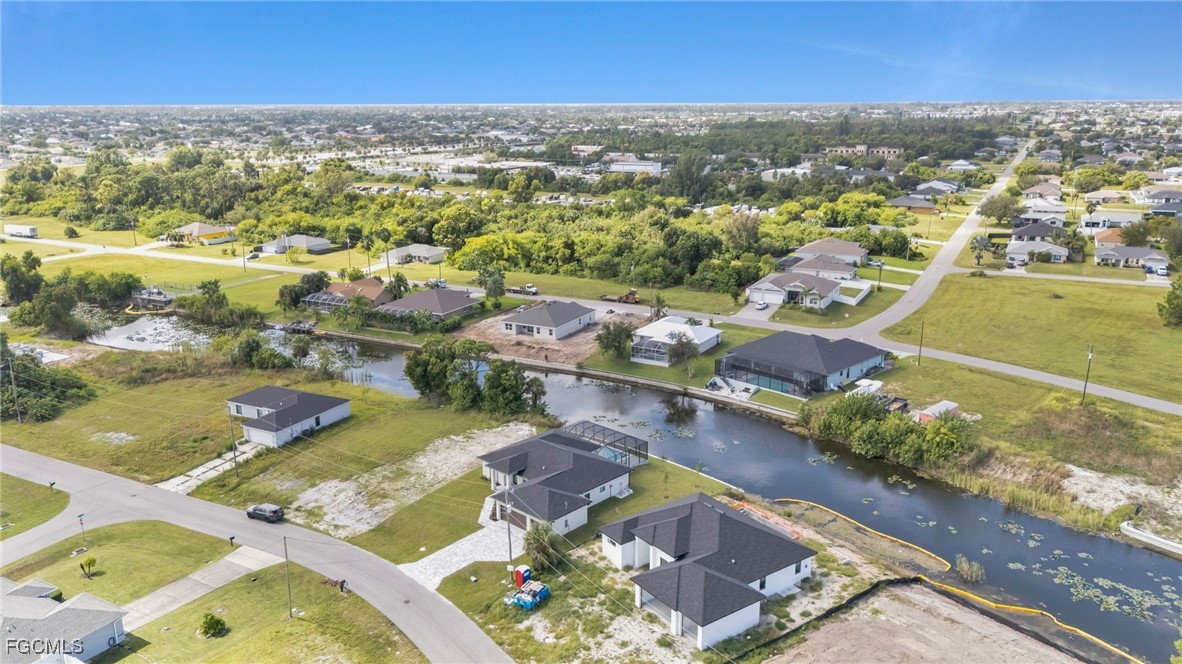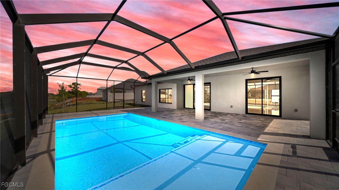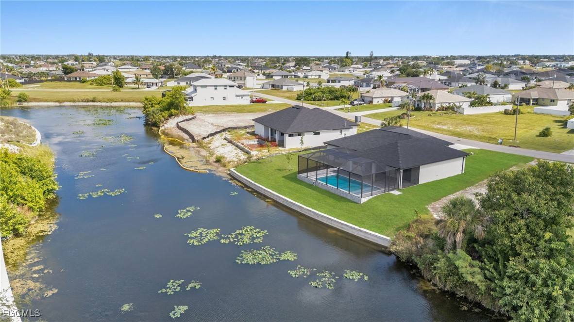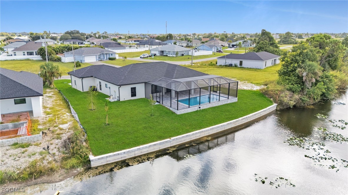 Brand new home with a pool and direct freshwater canal access with seawall. Connected to city water, sewer, and irrigation. Inside, enjoy high ceilings, an open layout, and premium finishes. The gourmet kitchen includes granite counters, a large island, soft-close cabinetry, and stainless steel appliances. Sliding glass doors open from the living area onto a spacious lanai with scenic water views. The primary suite offers sliders to the screened lanai and pool, dual walk-in closets with built-ins, and a spa-style bath with dual vanities and a large tiled walk-in shower. Outdoors, find a paved driveway and lanai, full pool cage, and alarmed pool access doors. The home features hurricane impact windows and doors, a 3 car garage, inside laundry with cabinetry, and tile flooring throughout. No HOA. Outside of flood zone. Come with 2-10 warranty for piece of mind.
