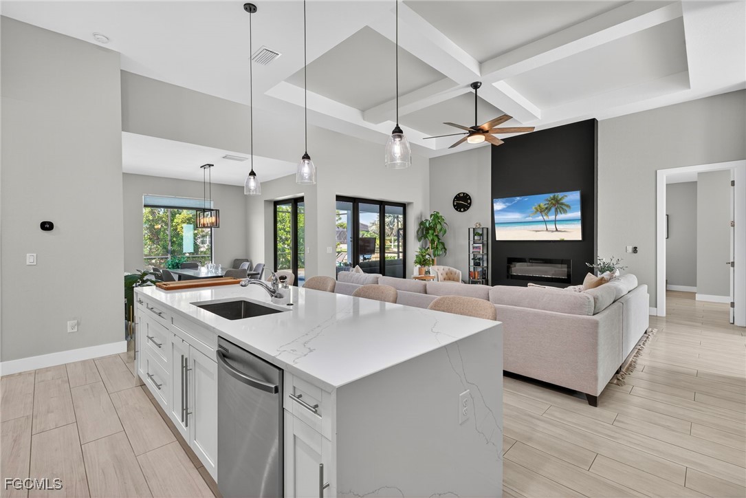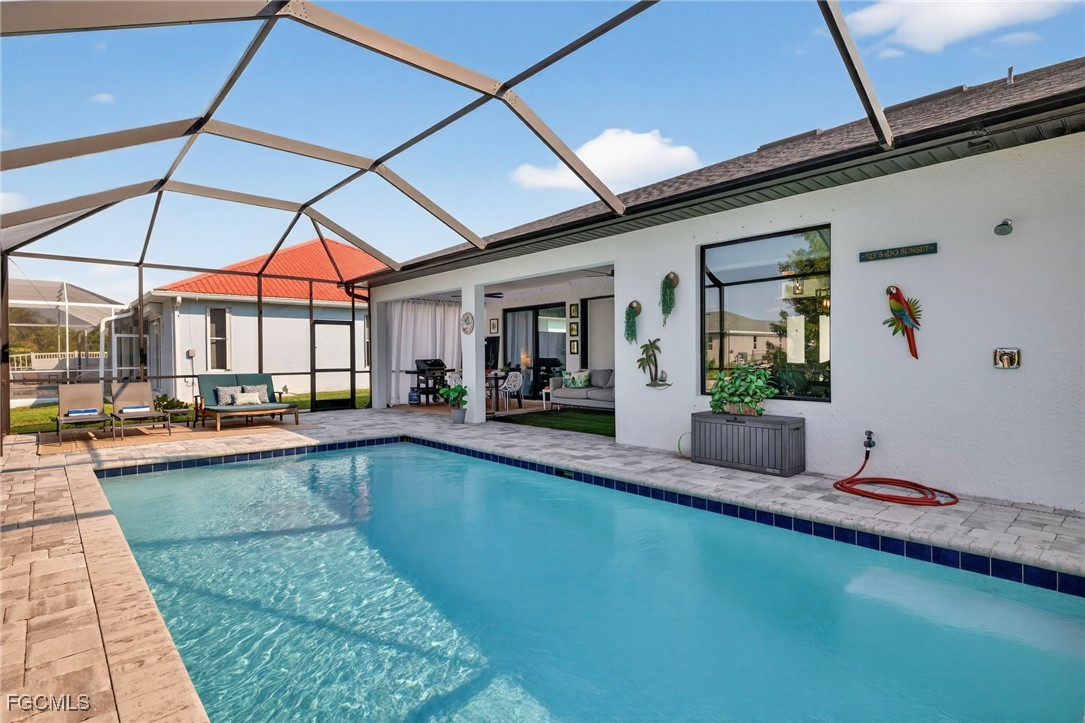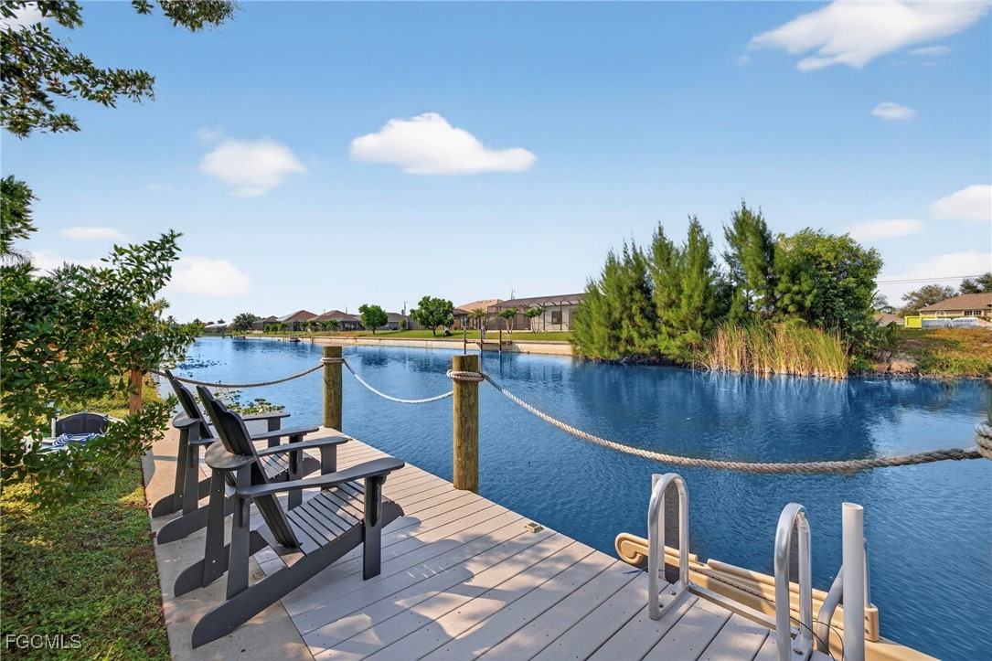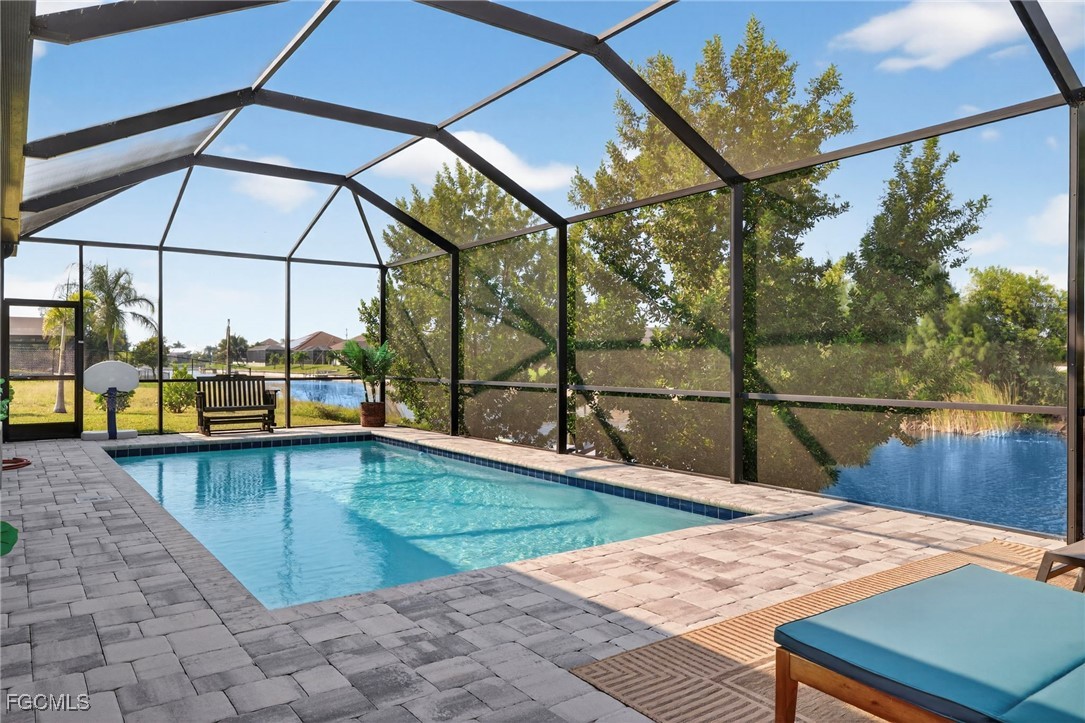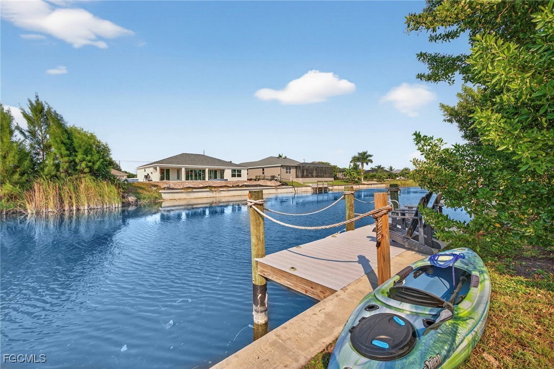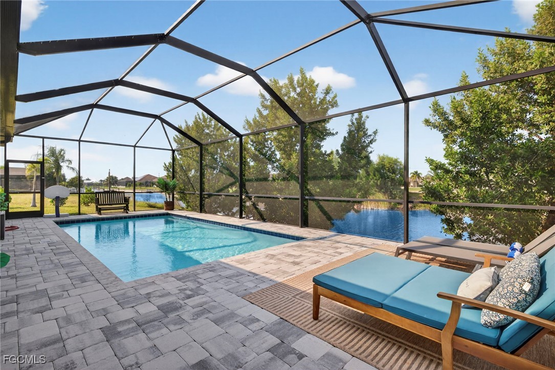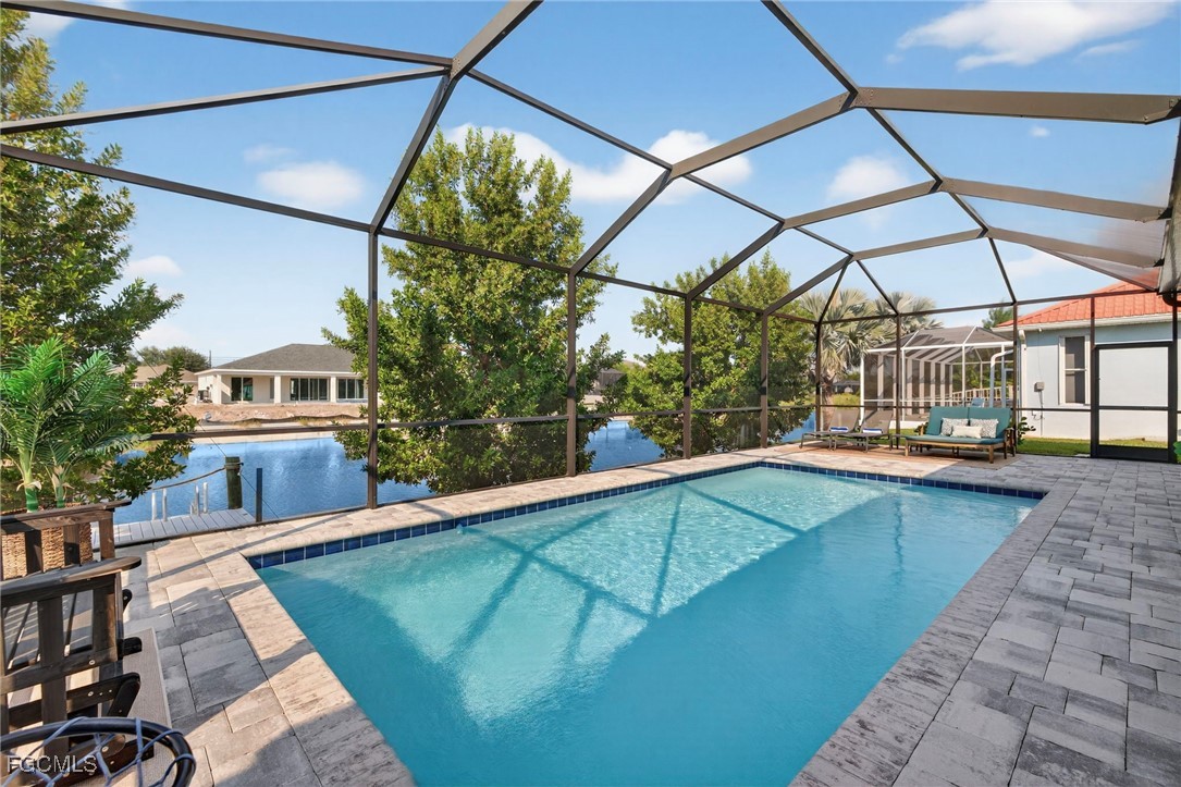 Coastal Modern Florida Living at its Finest! Waterfront Heated-Pool Home in SW Cape Coral. *All Assessments Paid* and *No Flood Insurance Required*. Experience elevated design and attention to detail in this 2021-built waterfront pool home located in the highly desirable Southwest Cape Coral. Perfectly situated on a freshwater canal with '2024 Composite Dock, this Coastal Modern residence blends refined finishes, open spaces, and a serene color palette to create a bright and elegant atmosphere throughout. Step inside to discover volume ceilings, high-end finishes, and a seamless open-concept floor plan connecting the great room, dining area, and gourmet kitchen. The adjoining office/den is thoughtfully sectioned off from the living area by a stylish sliding barn door, offering both privacy and versatility ideal for a home office or guest space. A modern electric fireplace with adjustable lighting provides an inviting focal point perfect for year round ambience, with or without heat. The home features tile flooring throughout, modern ceiling fans in every room, a walk-in pantry, and an indoor laundry room with sink for added convenience. The primary suite spans the entire right wing of the home and offers private access to the pool area. Its luxurious en-suite bath includes a slipper-style soaking tub, dual vanities, and a spacious walk-in shower. The guest bedrooms, each with walk-in closets, are located on the opposite side for maximum privacy. The guest bath includes pool access. Step outside to your outdoor oasis, the spacious undercover lanai showcases paver decking through out creating a perfect area for family gatherings and entertaining or peaceful waterfront relaxation at pool side. Enjoy the outdoor shower and take in the tranquil canal views that make this home feel like a resort retreat. Comfort and safety in mind, this home is in X Flood Zone *No Flood Insurance Required* Huge Savings! Features hurricane shutters for all Energy Efficient doors and windows, providing storm ready peace of mind and year-round comfort. The dock provides easy access for kayaking, boating, and fishing, and additional landscaping enhances privacy, creating the perfect backdrop for outdoor living. Additional features include a sprayed epoxy-style finish on the garage floor, offering durability, a clean modern look, and easy maintenance, the perfect touch to complement this move in ready home. City assessments have been paid in full, making this home completely move in ready with no additional expenses. Conveniently Located to Cape Harbour, the Westin Resort, Downtown Cape Coral, Beaches and much more. Why wait to build? This barely lived in 2021 home offers everything you need to start enjoying the Florida lifestyle today. Whether you’re looking for a full-time residence or a vacation home retreat, this property offers *Endless Opportunities* for the right buyer. Schedule your private showing today!