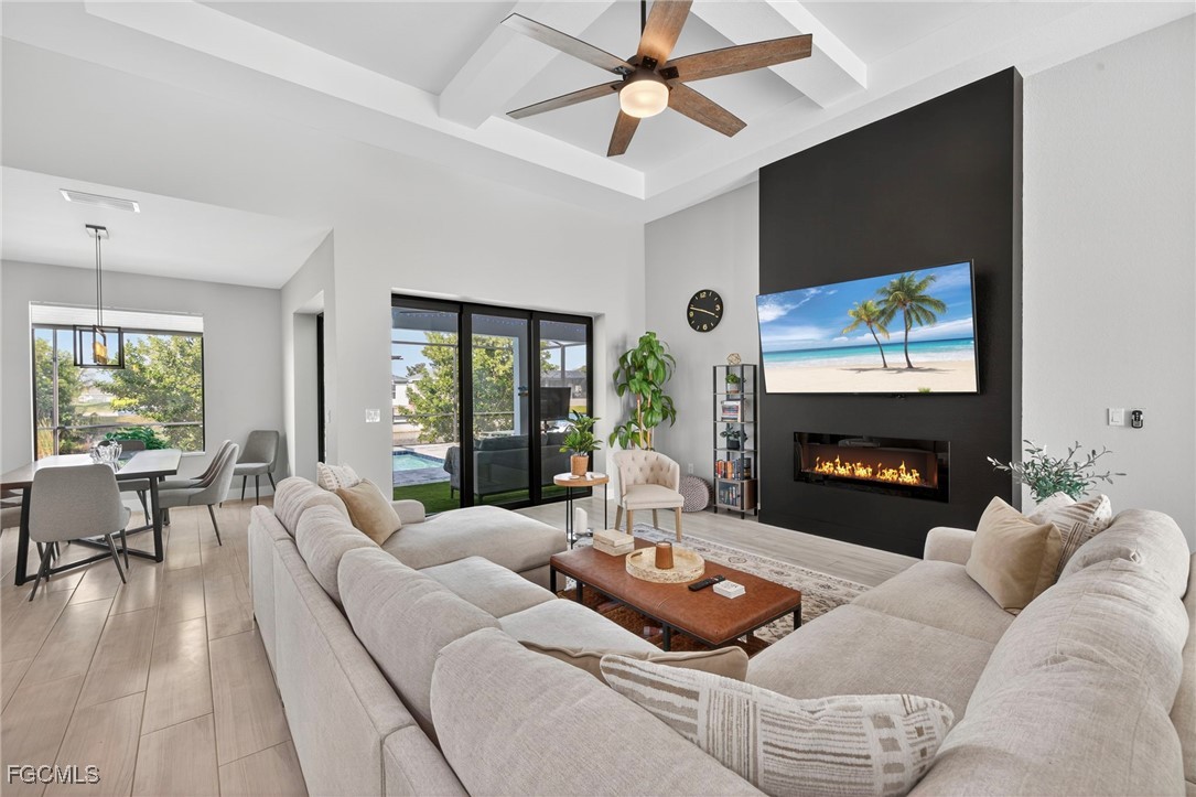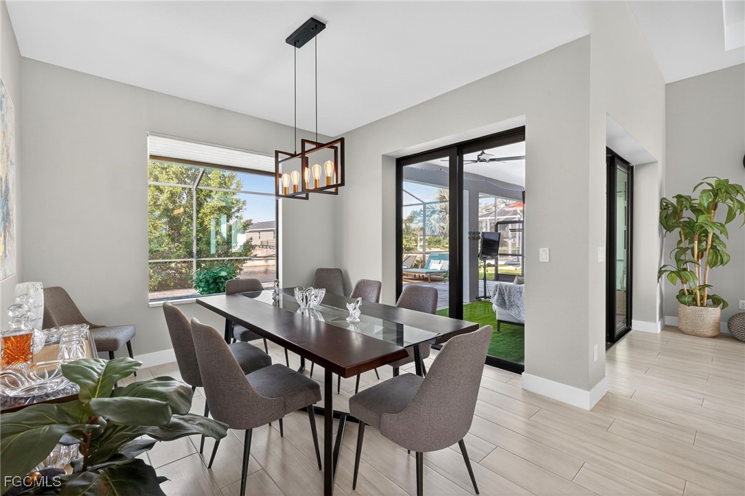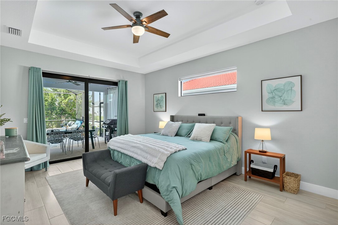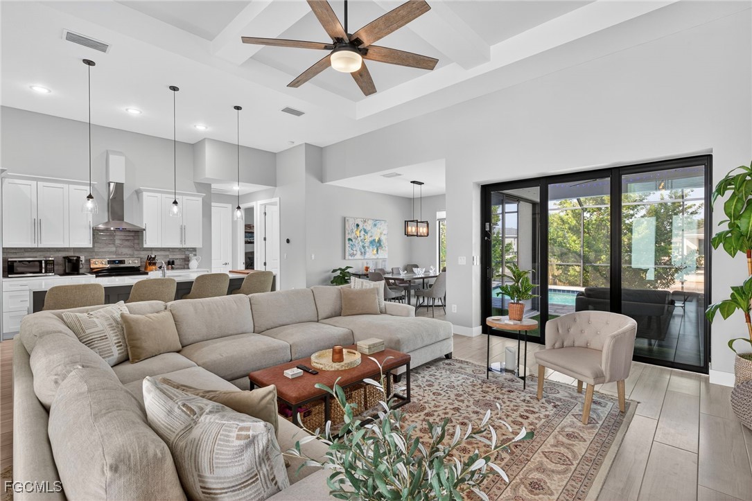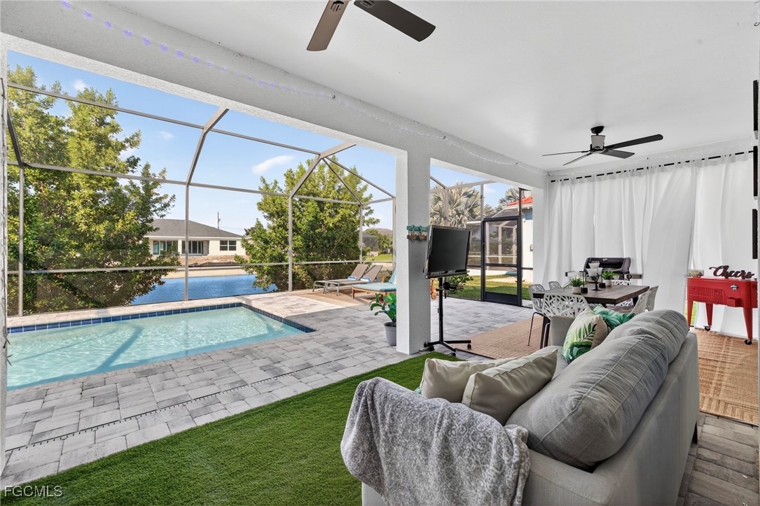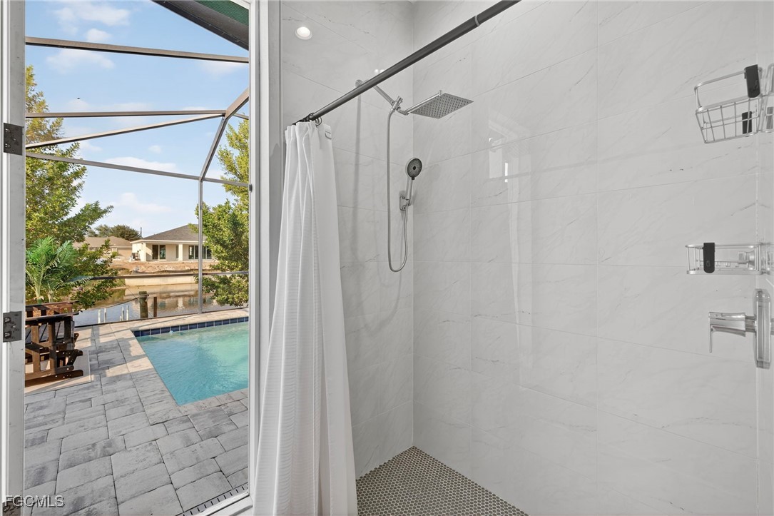 Coastal Modern Florida Living at its Finest! Waterfront Heated-Pool Home in SW Cape Coral. *All Assessments Paid* and *No Flood Insurance Required*. Experience elevated design and attention to detail in this 2021-built waterfront pool home located in the highly desirable Southwest Cape Coral. Perfectly situated on a freshwater canal with '2024 Composite Dock, this Coastal Modern residence blends refined finishes, open spaces, and a serene color palette to create a bright and elegant atmosphere throughout. Step inside to discover volume ceilings, high-end finishes, and a seamless open-concept floor plan connecting the great room, dining area, and gourmet kitchen. The adjoining office/den is thoughtfully sectioned off from the living area by a stylish sliding barn door, offering both privacy and versatility ideal for a home office or guest space. A modern electric fireplace with adjustable lighting provides an inviting focal point perfect for year round ambience, with or without heat. The home features tile flooring throughout, modern ceiling fans in every room, a walk-in pantry, and an indoor laundry room with sink for added convenience. The primary suite spans the entire right wing of the home and offers private access to the pool area. Its luxurious en-suite bath includes a slipper-style soaking tub, dual vanities, and a spacious walk-in shower. The guest bedrooms, each with walk-in closets, are located on the opposite side for maximum privacy. The guest bath includes pool access. Step outside to your outdoor oasis, the spacious undercover lanai showcases paver decking through out creating a perfect area for family gatherings and entertaining or peaceful waterfront relaxation at pool side. Enjoy the outdoor shower and take in the tranquil canal views that make this home feel like a resort retreat. Comfort and safety in mind, this home is in X Flood Zone *No Flood Insurance Required* Huge Savings! Features hurricane shutters for all Energy Efficient doors and windows, providing storm ready peace of mind and year-round comfort. The dock provides easy access for kayaking, boating, and fishing, and additional landscaping enhances privacy, creating the perfect backdrop for outdoor living. Additional features include a sprayed epoxy-style finish on the garage floor, offering durability, a clean modern look, and easy maintenance, the perfect touch to complement this move in ready home. City assessments have been paid in full, making this home completely move in ready with no additional expenses. Conveniently Located to Cape Harbour, the Westin Resort, Downtown Cape Coral, Beaches and much more. Why wait to build? This barely lived in 2021 home offers everything you need to start enjoying the Florida lifestyle today. Whether you’re looking for a full-time residence or a vacation home retreat, this property offers *Endless Opportunities* for the right buyer. Schedule your private showing today!