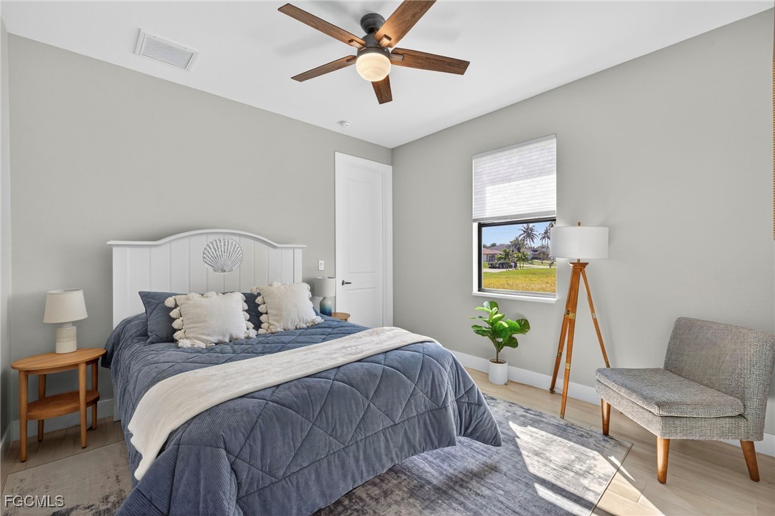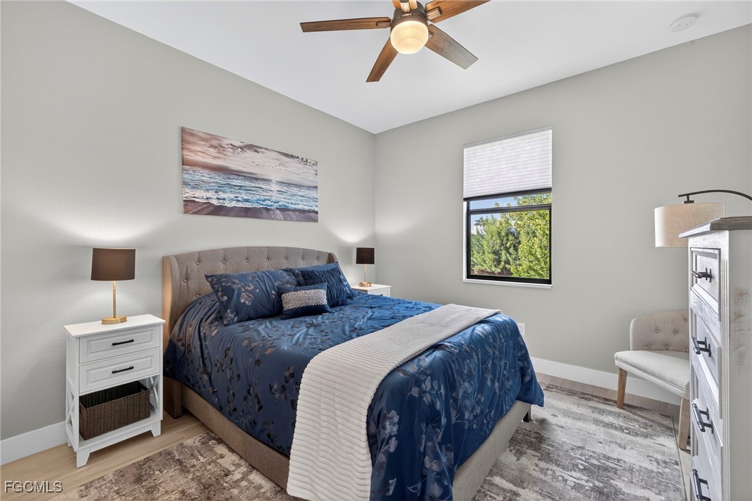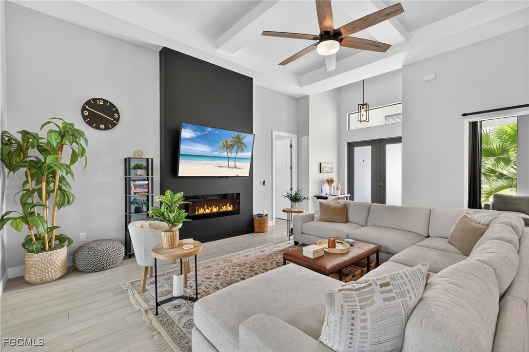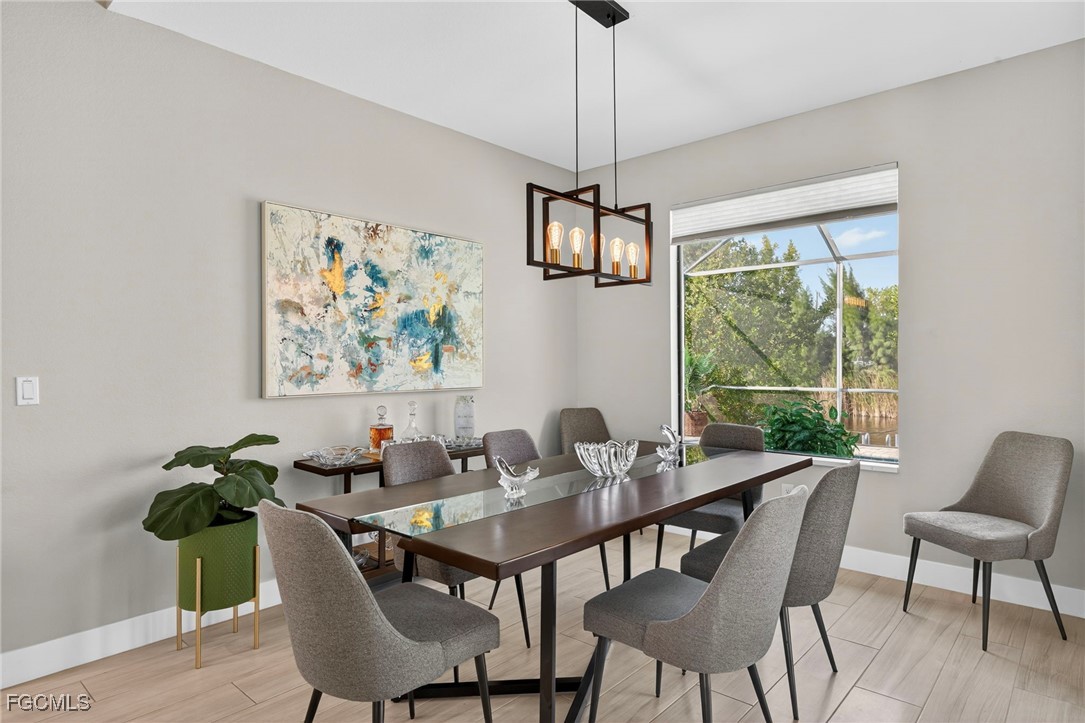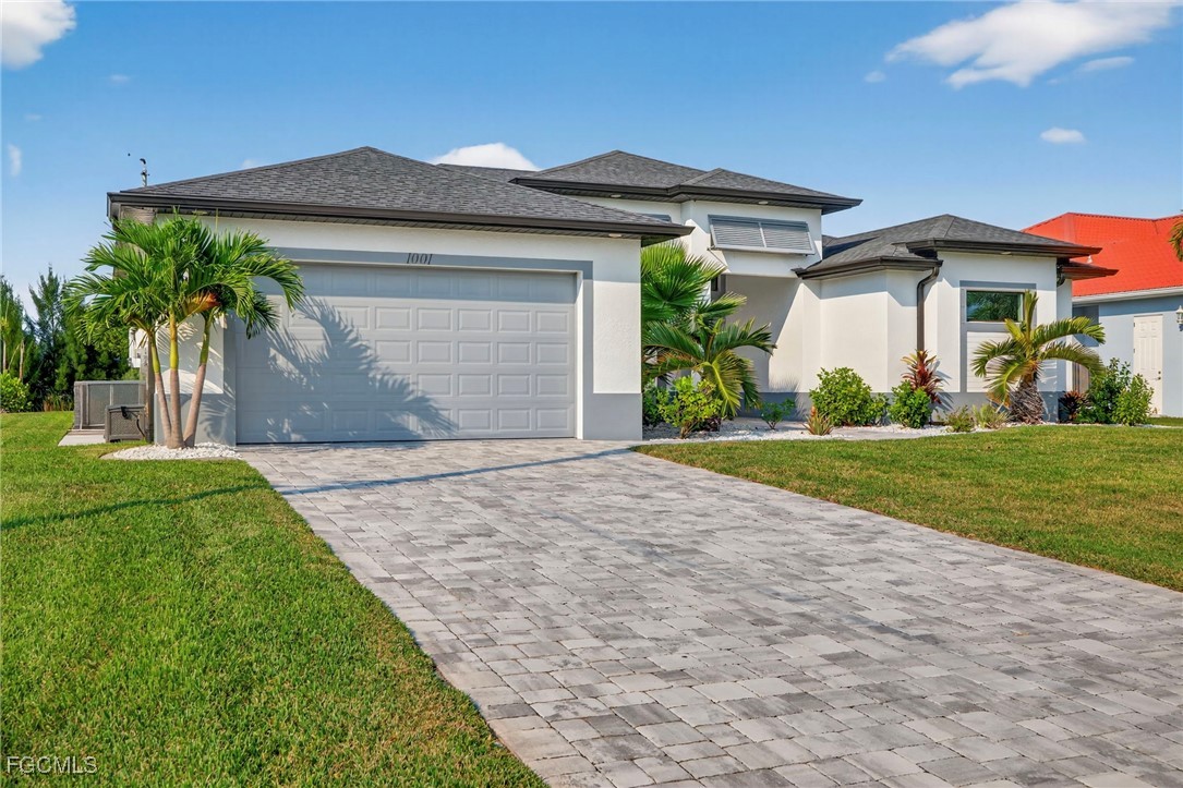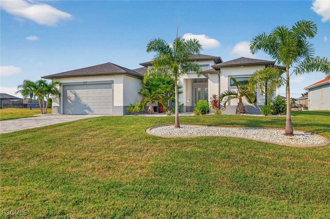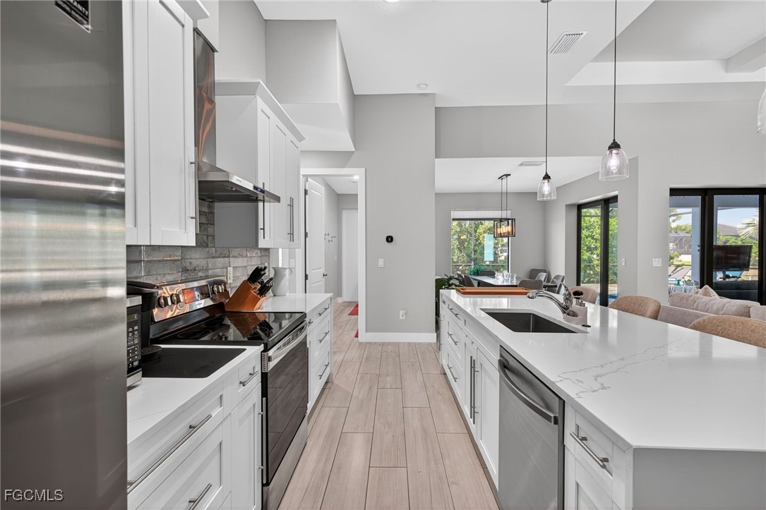 Coastal Modern Florida Living at its Finest! Waterfront Heated-Pool Home in SW Cape Coral. *All Assessments Paid* and *No Flood Insurance Required*. Experience elevated design and attention to detail in this 2021-built waterfront pool home located in the highly desirable Southwest Cape Coral. Perfectly situated on a freshwater canal with '2024 Composite Dock, this Coastal Modern residence blends refined finishes, open spaces, and a serene color palette to create a bright and elegant atmosphere throughout. Step inside to discover volume ceilings, high-end finishes, and a seamless open-concept floor plan connecting the great room, dining area, and gourmet kitchen. The adjoining office/den is thoughtfully sectioned off from the living area by a stylish sliding barn door, offering both privacy and versatility ideal for a home office or guest space. A modern electric fireplace with adjustable lighting provides an inviting focal point perfect for year round ambience, with or without heat. The home features tile flooring throughout, modern ceiling fans in every room, a walk-in pantry, and an indoor laundry room with sink for added convenience. The primary suite spans the entire right wing of the home and offers private access to the pool area. Its luxurious en-suite bath includes a slipper-style soaking tub, dual vanities, and a spacious walk-in shower. The guest bedrooms, each with walk-in closets, are located on the opposite side for maximum privacy. The guest bath includes pool access. Step outside to your outdoor oasis, the spacious undercover lanai showcases paver decking through out creating a perfect area for family gatherings and entertaining or peaceful waterfront relaxation at pool side. Enjoy the outdoor shower and take in the tranquil canal views that make this home feel like a resort retreat. Comfort and safety in mind, this home is in X Flood Zone *No Flood Insurance Required* Huge Savings! Features hurricane shutters for all Energy Efficient doors and windows, providing storm ready peace of mind and year-round comfort. The dock provides easy access for kayaking, boating, and fishing, and additional landscaping enhances privacy, creating the perfect backdrop for outdoor living. Additional features include a sprayed epoxy-style finish on the garage floor, offering durability, a clean modern look, and easy maintenance, the perfect touch to complement this move in ready home. City assessments have been paid in full, making this home completely move in ready with no additional expenses. Conveniently Located to Cape Harbour, the Westin Resort, Downtown Cape Coral, Beaches and much more. Why wait to build? This barely lived in 2021 home offers everything you need to start enjoying the Florida lifestyle today. Whether you’re looking for a full-time residence or a vacation home retreat, this property offers *Endless Opportunities* for the right buyer. Schedule your private showing today!