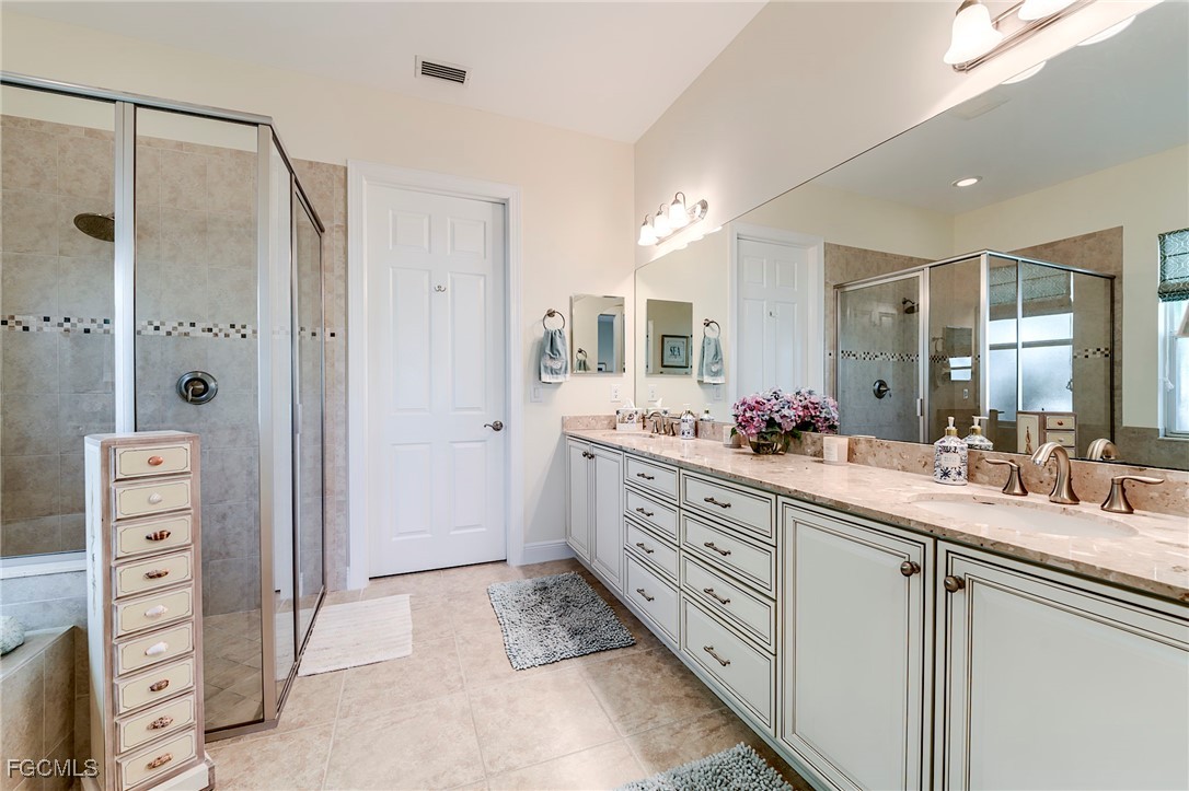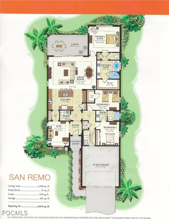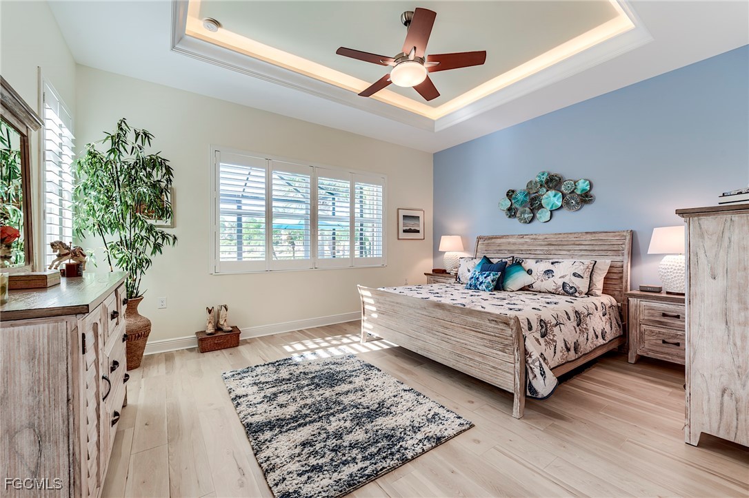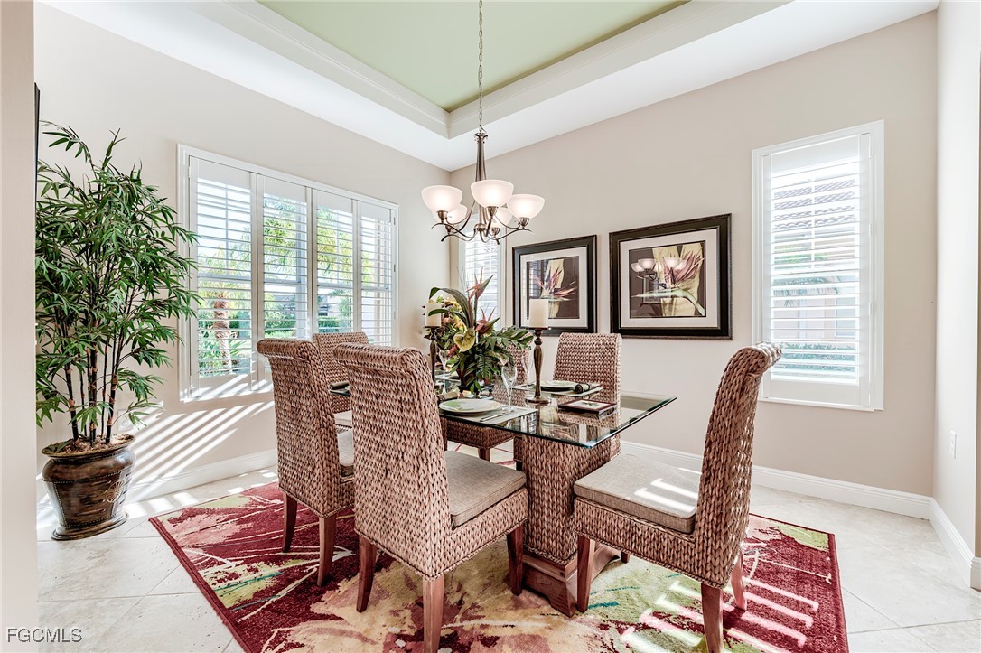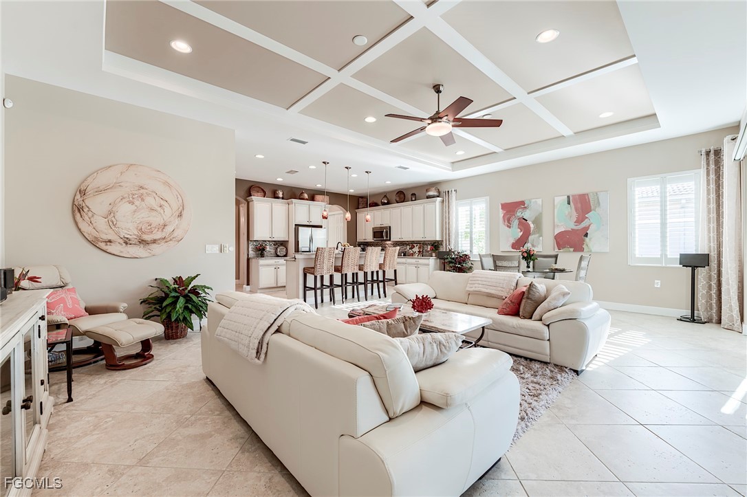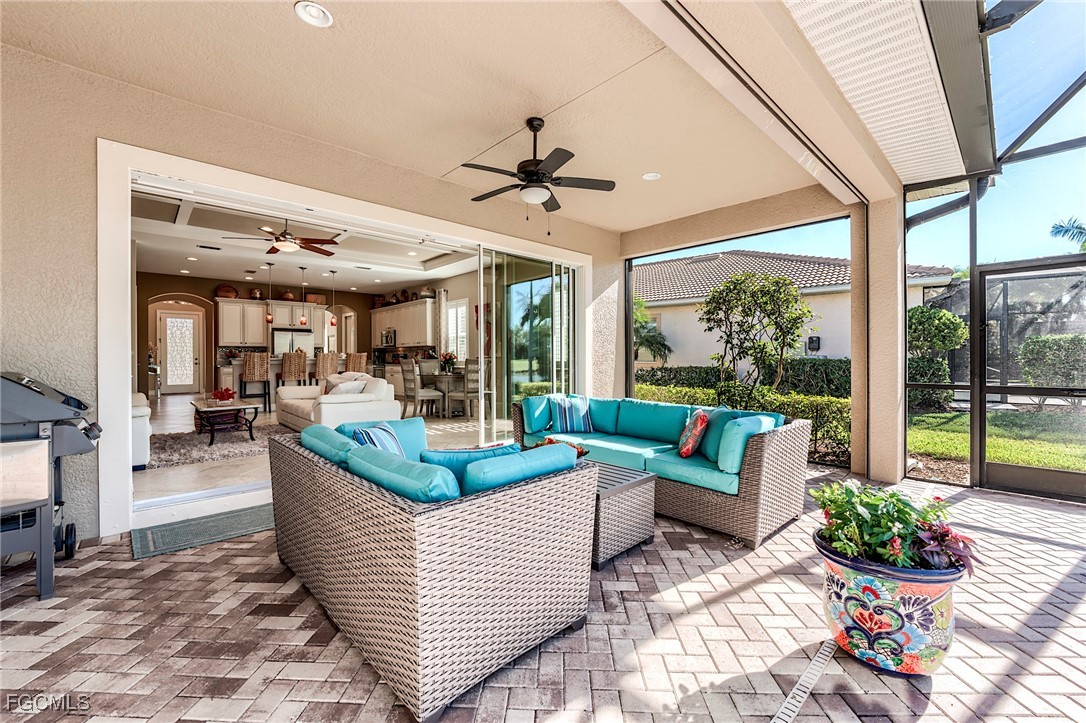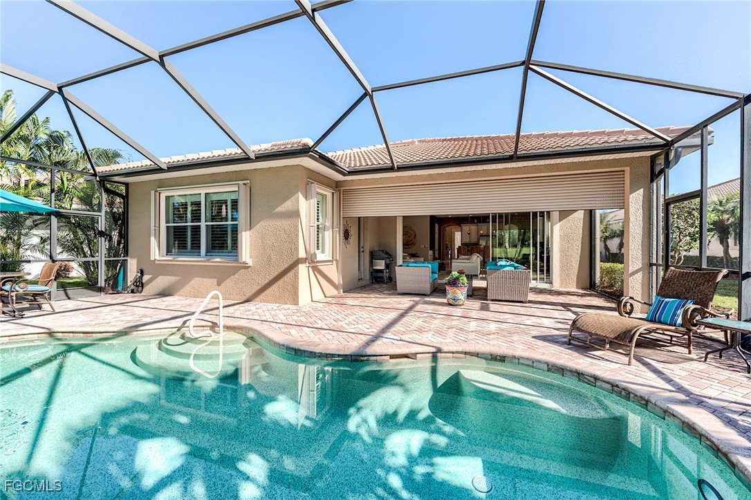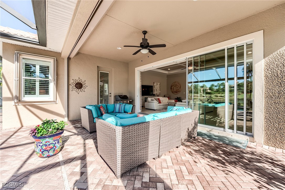 Rarely available, The San Remo, built by WCI, is beautifully situated along a gorgeous waterway and the 6th green on the Ibis course. This amazing home is located on an oversized private lot in the Carena neighborhood at Pelican Preserve, one of the nation's top 55+ active lifestyle communities. This stunning, well-maintained 3-bedroom, 2.5-bathroom home also features a flex room that can be customized to suit your personal needs. The spacious open-concept design features 10-foot-high ceilings and 8-foot-high doors with tasteful custom millwork throughout, taking full advantage of the volume ceilings. Granite countertops, soft-close cabinets and drawers, stainless steel kitchen appliances, Samsung washer, and dryer replaced in 2023, AC replaced in 2022, water heater replaced in 2024. Additional features include 20” diagonal tile in the main living area and Cortex Luxury Vinyl Plank flooring in all bedrooms, plantation shutters throughout, heavy flake epoxy garage floor completed in 2024, and a beautiful, heated pool with a new salt system set inside a large patio and spacious covered lanai with a large Panoramic window with new super screen added in 2021 provide a one-of-a-kind view. All windows and doors are equipped with easy-to-use accordion style storm shutters and electric roll-down for the lanai, providing protection against harsh weather conditions. The interior of the home was repainted in 2022, while the exterior was completed in 2024. Additionally, the exterior pavers have been resealed, and the roof was just professionally cleaned. Pelican Preserve's town center has recently been expanded to offer a wide range of amenities for residents, including staffed fitness and wellness facilities, indoor and outdoor pools, tennis and Pickleball courts, restaurants, live entertainment, social activities, a concert pavilion, cinema, and more. Experience luxury living in a vibrant community at Pelican Preserve's Carena neighborhood. Optional golf memberships are available for those who enjoy hitting the links. To learn more about this exceptional community, visit pelicanpreservelifestyles.com/lifestyle.