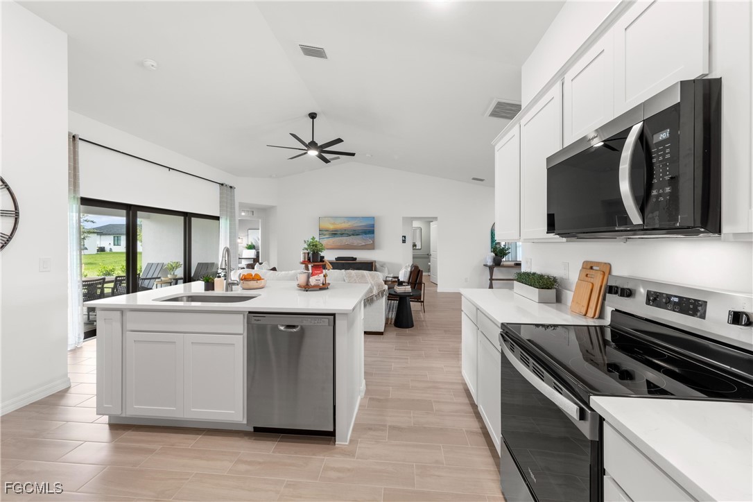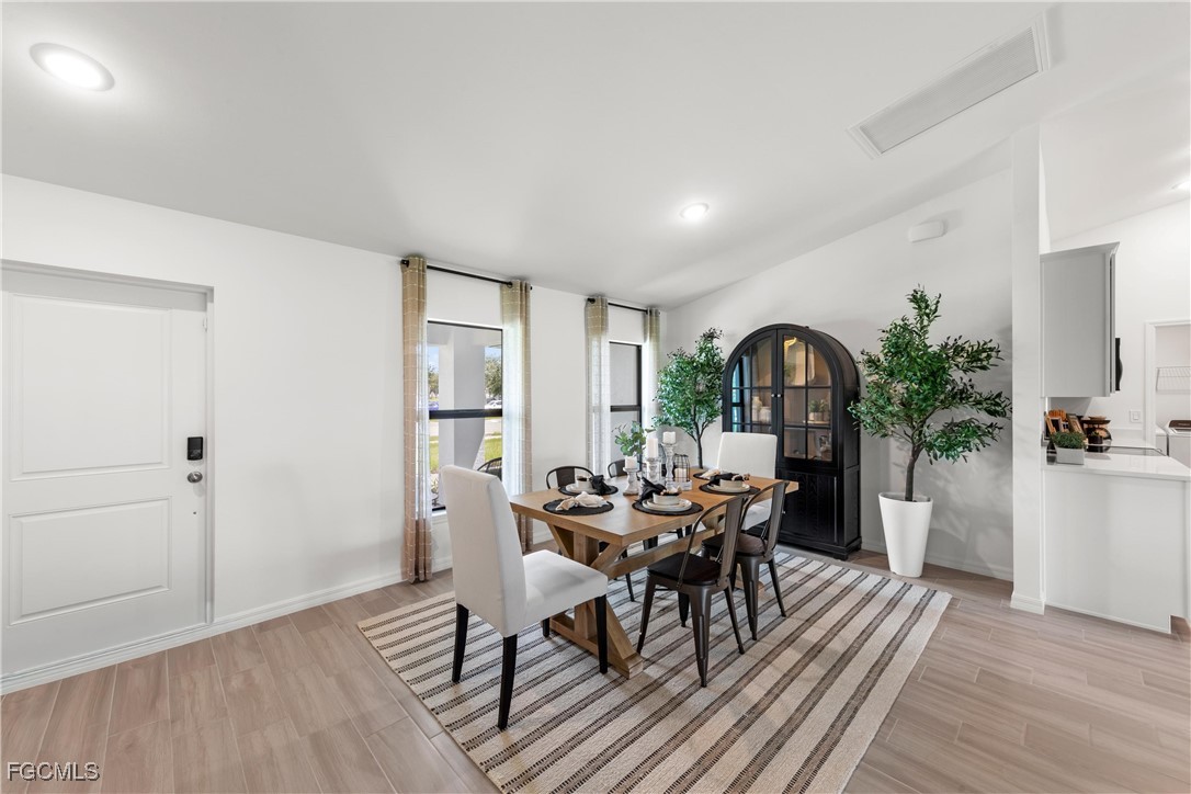 layout with a vaulted ceiling creates a sense of spaciousness and flow. The dining area with