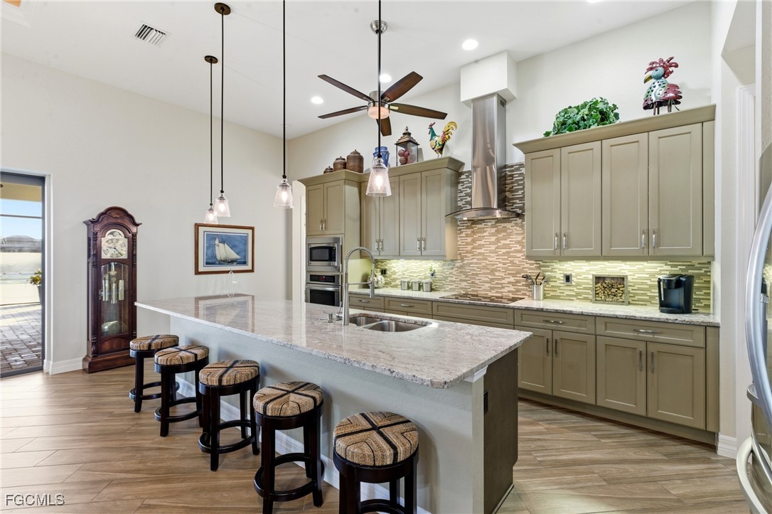 The screened lanai extends the length of the home, offering plenty of room to relax by the pool or dine al fresco. The outdoor kitchen, sheltered from the elements, includes a movable grill, while ambient lighting sets the perfect mood as the sun sets.
