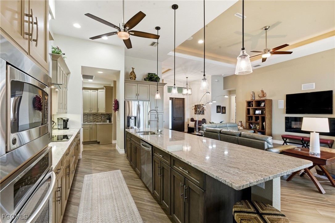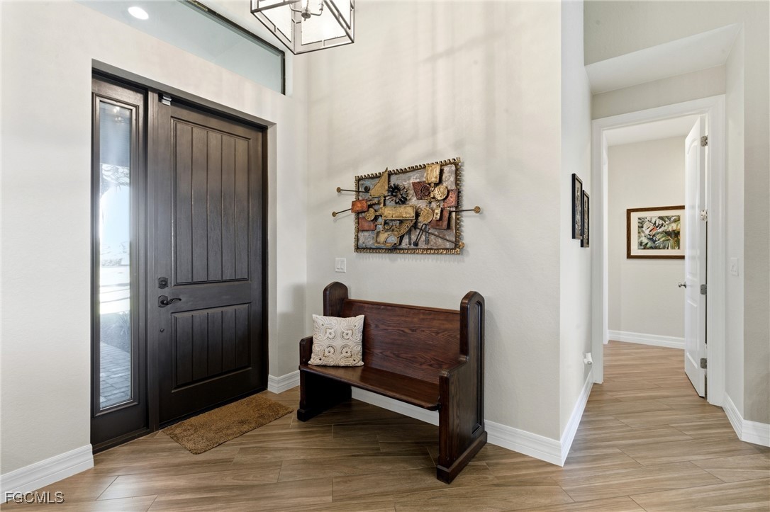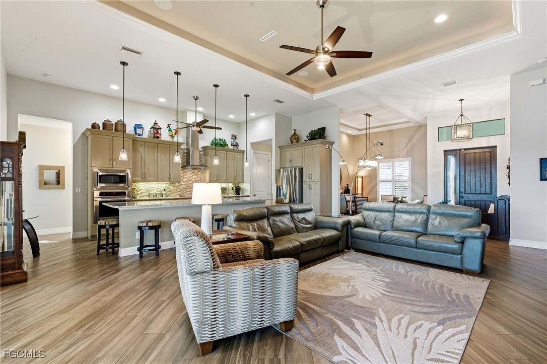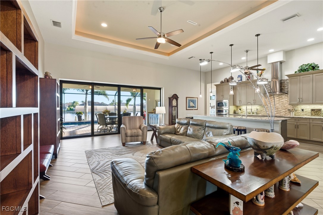 A beautiful front door opens to an expansive great room with soaring 12-foot coffered ceilings, where the open layout flows effortlessly from one space to the next. The living area features an electric fireplace and a 4-panel sliding glass door that transitions seamlessly from indoors to the screened lanai.