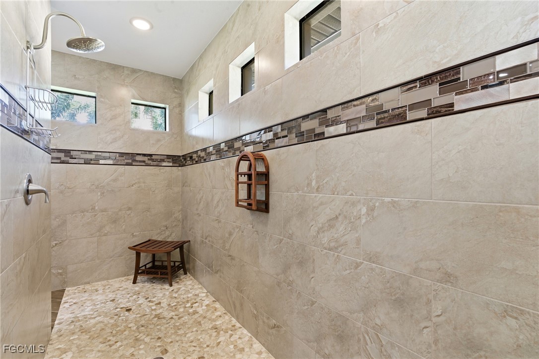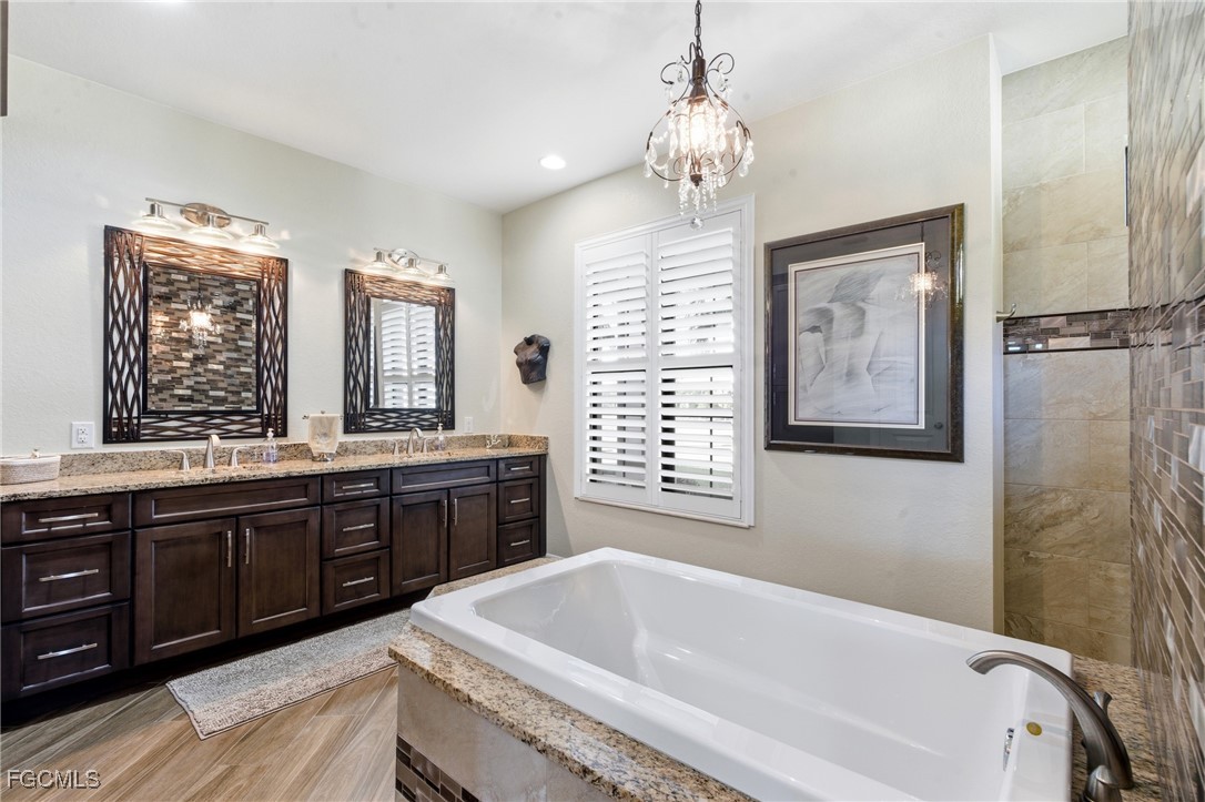 The spacious primary suite offers a tranquil retreat, with sliding glass doors leading directly to the lanai. The spa-inspired ensuite bath features a central soaking tub, a walk-through shower, dual sinks, and two generous walk-in closets. The split-bedroom floor plan ensures privacy for guests: Bedroom 2 shares a guest bath, while Bedroom 3 opens to the lanai and features an ensuite that doubles as a pool bath.