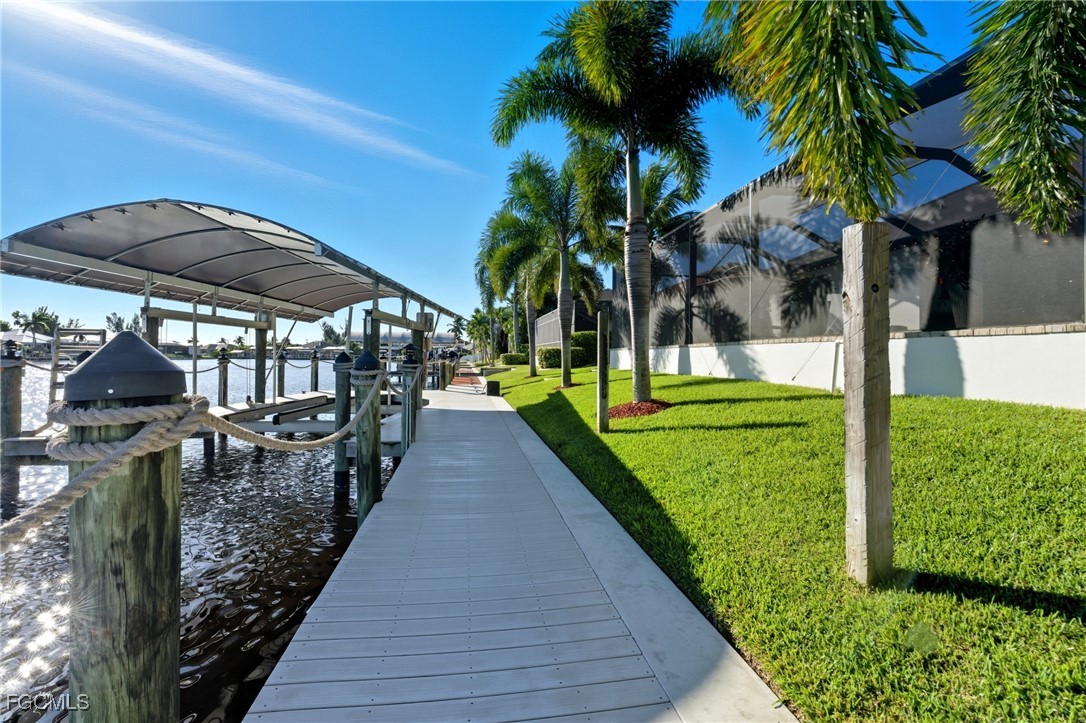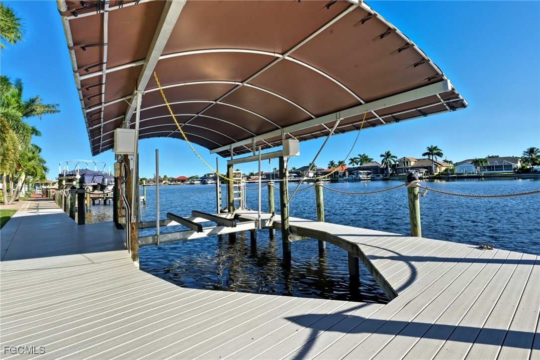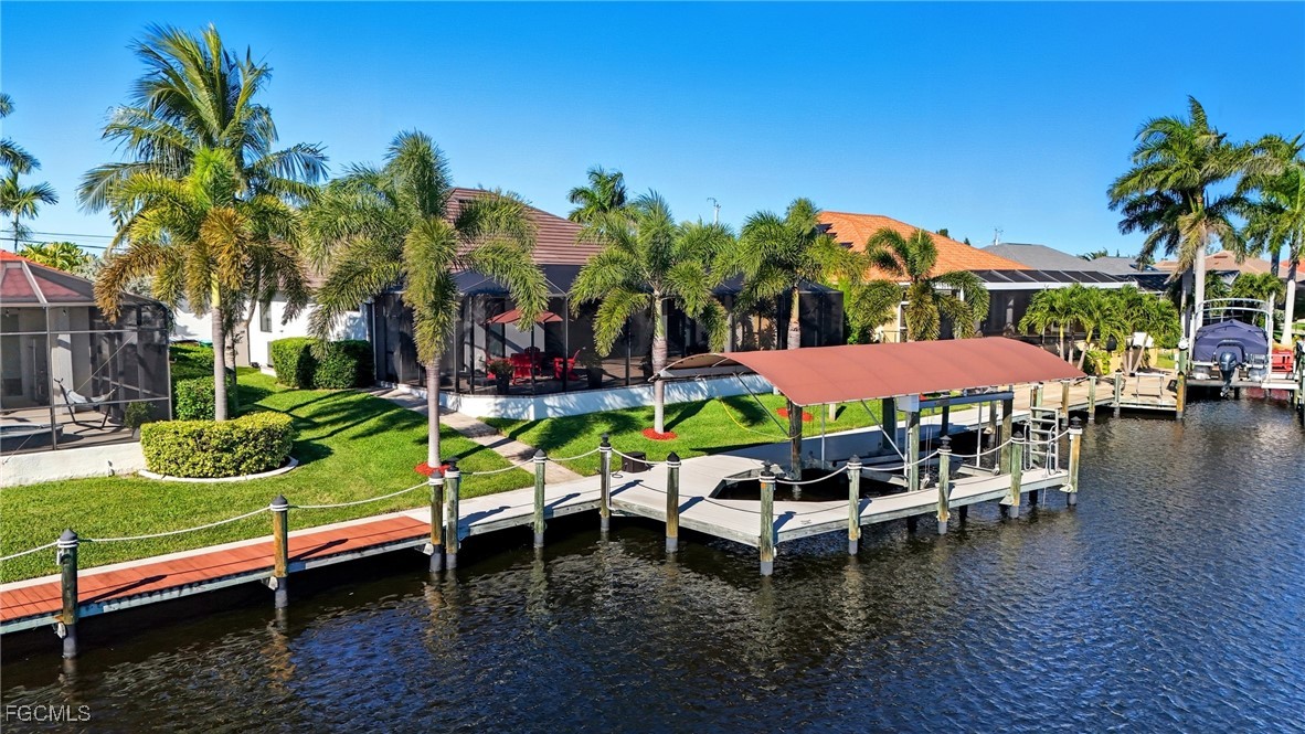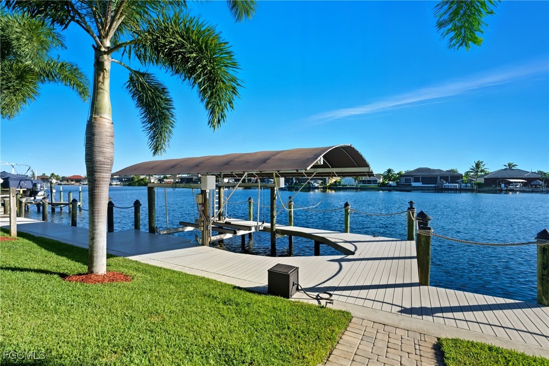 Located on the 400-foot-wide Ceitus Lake—with direct access to Pine Island Sound and beyond—this home includes a captains walk, wrap-around composite dock, a 10,000 lb. boat lift, and a boat canopy. Additional highlights include wood-look tile flooring throughout (with carpet in the guest bedrooms), impact windows and doors, a new metal roof (2023), and an air-conditioned storage area off the garage—ideal for seasonal items, coffered ceiling in main bedroom.
