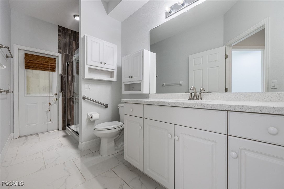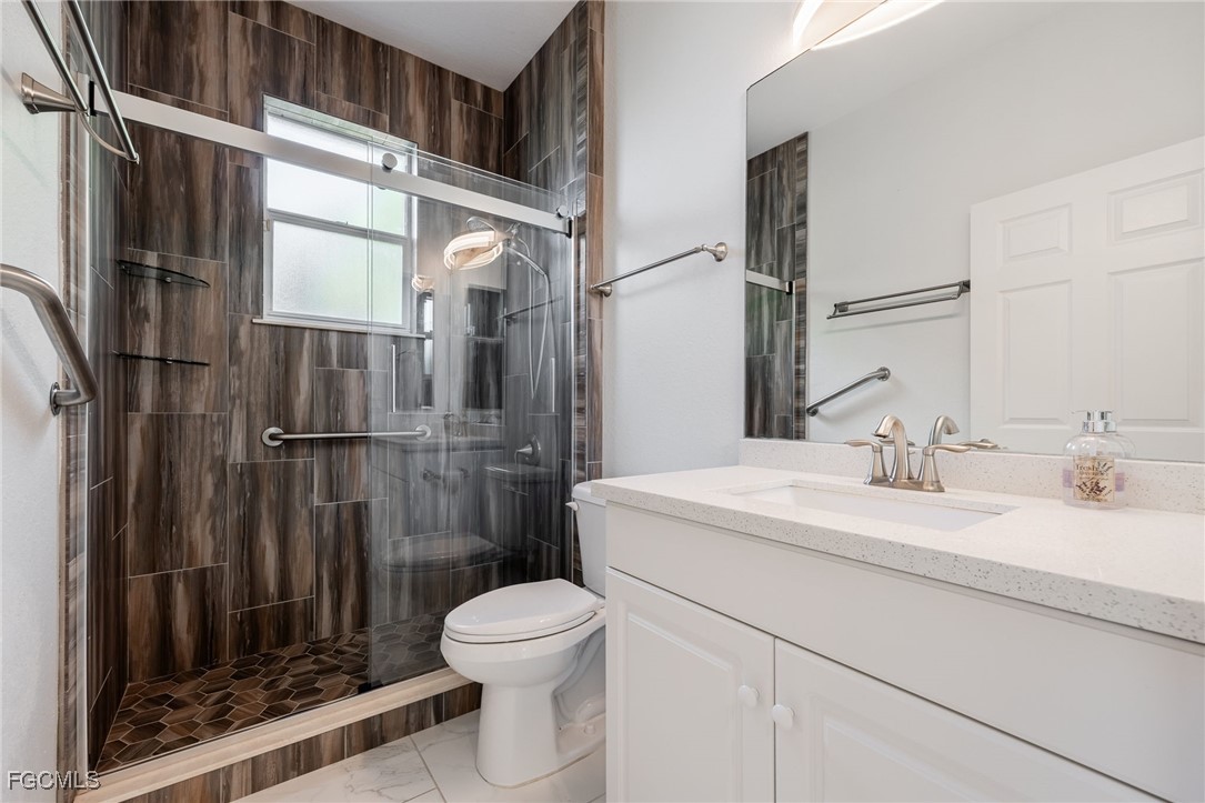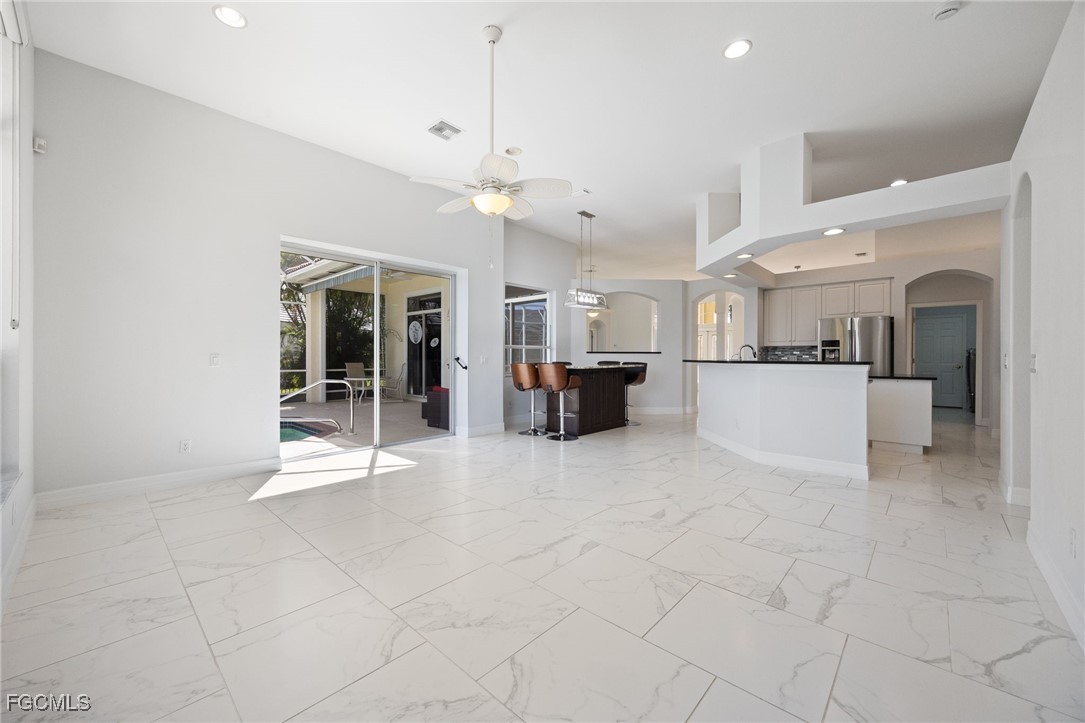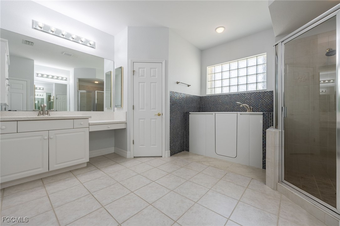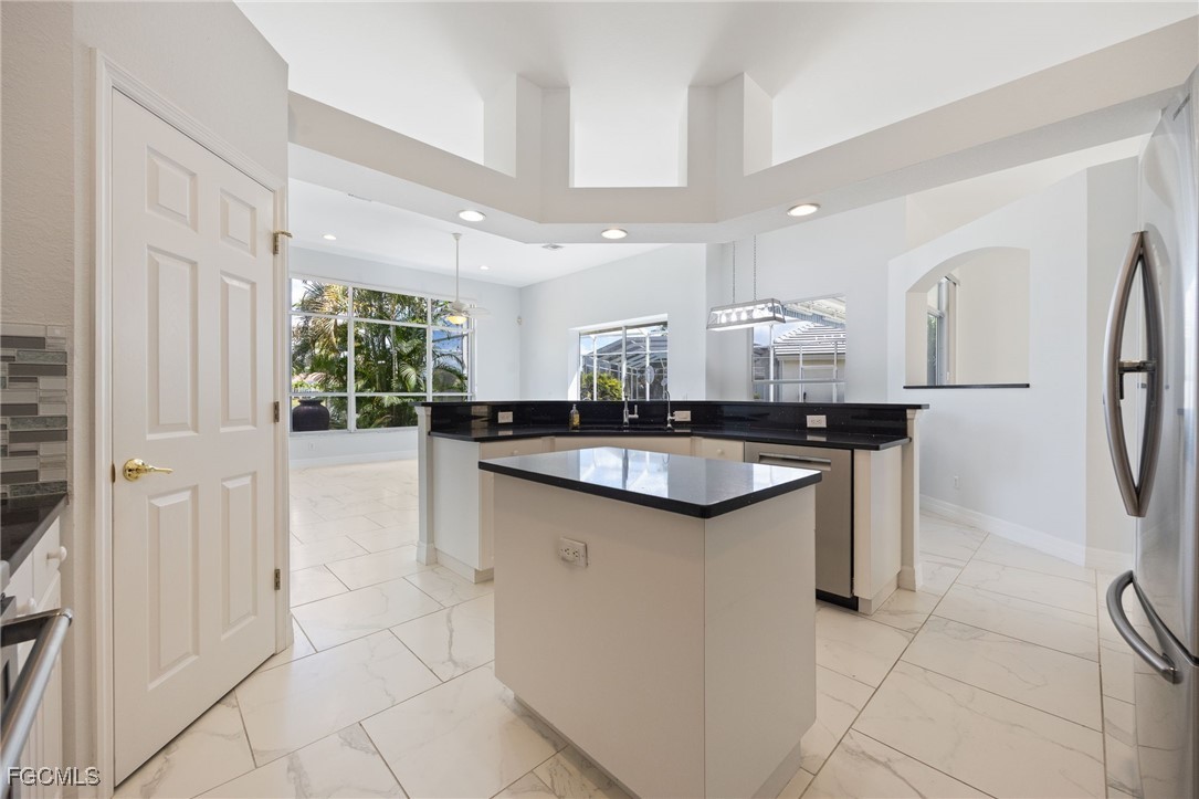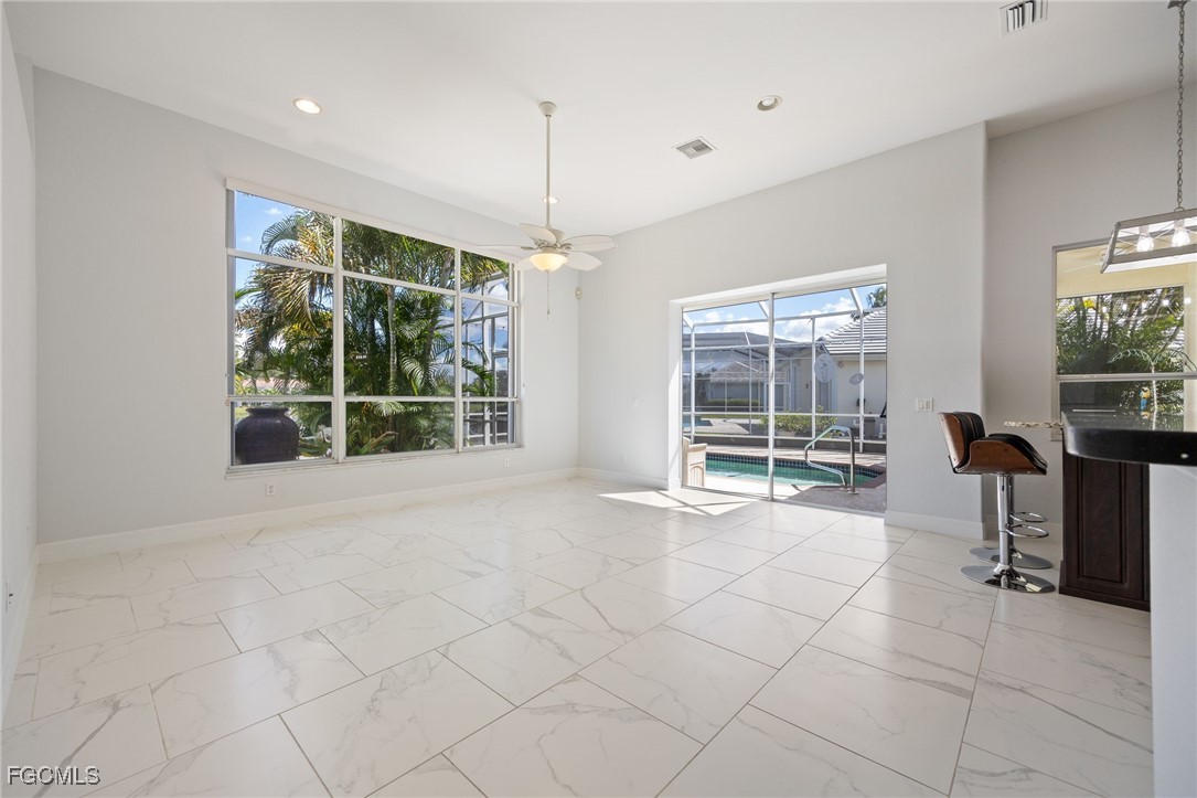 The meandering walkway from the front to the rear leads to an enchanting tropical paradise with palms, plantings, and seating areas to enjoy and reflect on the gorgeous lake view. You can say Outstanding! The lanai boasts a retractable awning overlooking the pool, spa, and the awesome view. You will love the beautiful flooring and lighting features throughout the home. The rooms are quite spacious. The step-in tub in the master bath is top of the line…it is a spa you will actually use. The other bathrooms have also been redone with quartz countertops and the beautiful barn door slider glass for the showers. You will love the look and the gliding sound. The seller had Cornerstone create the table in the informal kitchen-dining area. This unique piece of furniture has pullout drawers for extra storage plus 6 adjustable bar stools (table could seat 8 comfortably). Not to be outdone is the air conditioned garage with the epoxy floors. This is indeed a home that must be seen. We can’t wait to hear your comments.
